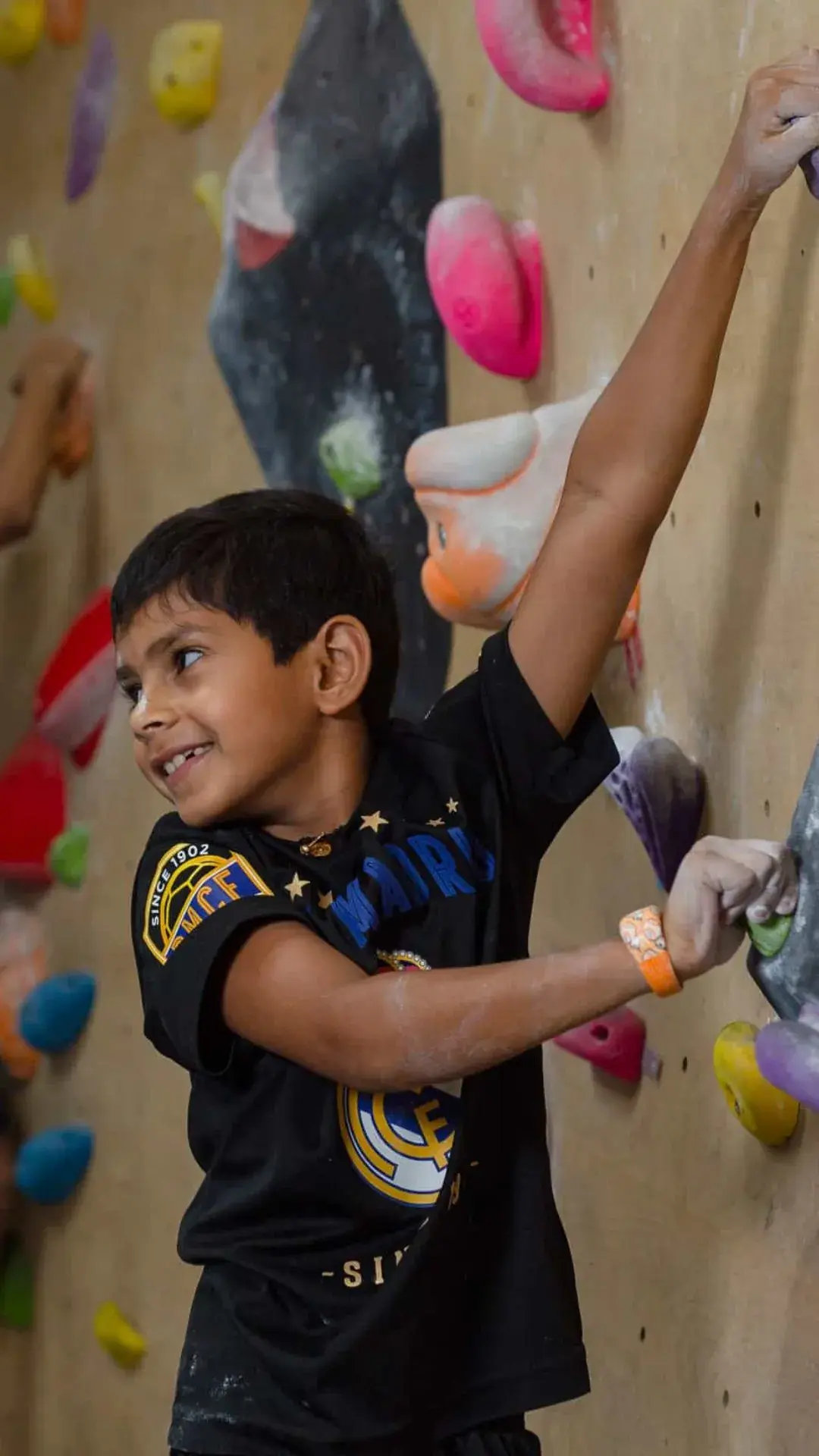 Rock climbing challenges children's muscles and improves endurance, flexibility, and coordination.