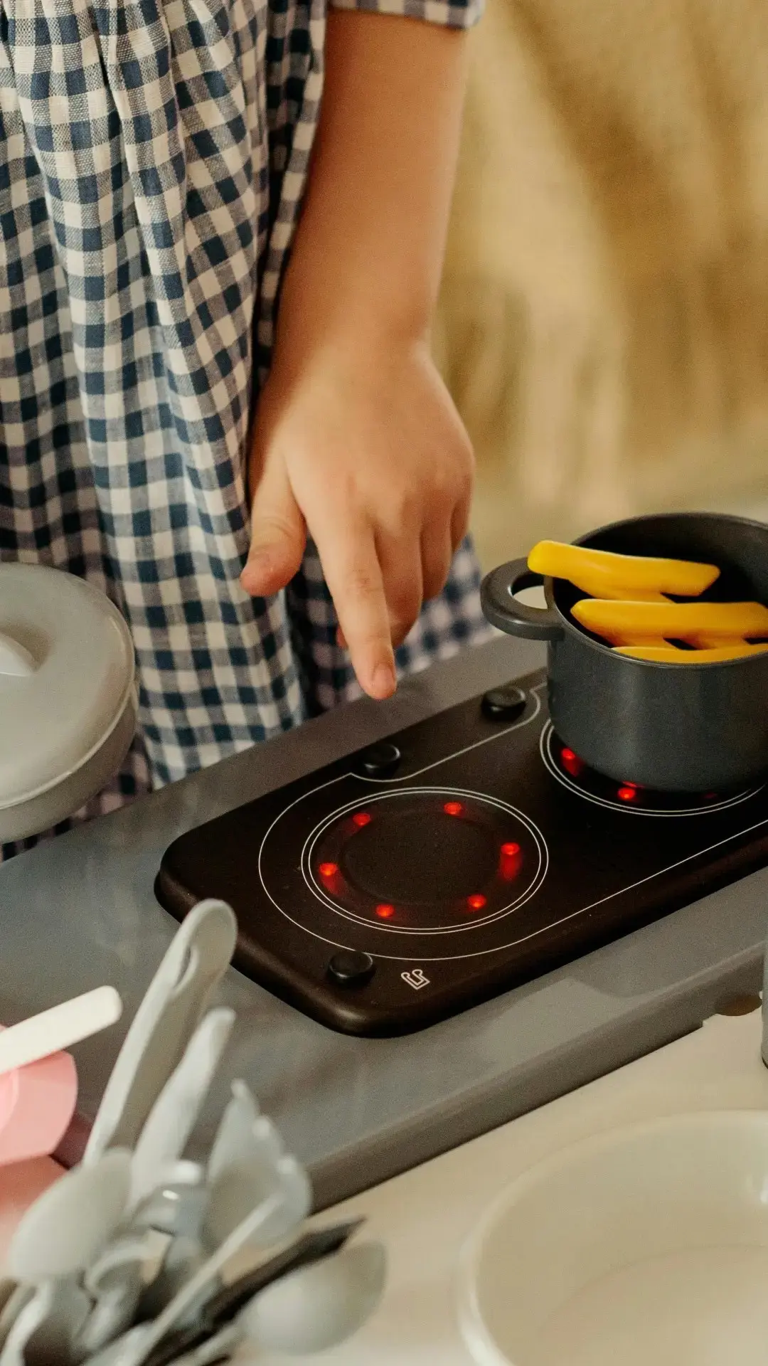 Simple kitchen activities like setting up a table with dishes, arranging groceries, or indulging in sensory play with vegetables can make kids more efficient.